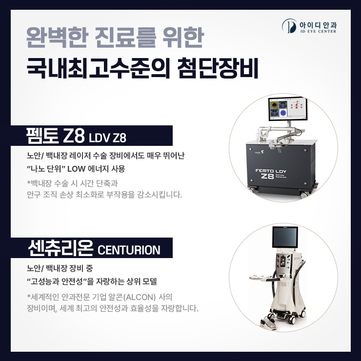 본원에서는 레이저를 바탕으로 진행하기 때문에 몸에 걸리는 부담은 줄이고 회복 속도를 낮췄습니다.안전성을 인정받은 펨토 ldvz8 레이저 장치는 기존 레이저보다 속도가 10-100배 정도 빠르고 수술시간을 줄여 안압상승을 억제하여 부작용을 감소시키는 등 안정적으로 개선이 가능합니다.또한 첨단 검사 장비를 활용한 61가지 안 종합검진을 통해 일반 검진으로는 진단이 어려웠던 안구 내 변화를 조기에 확인하고 예방할 수 있습니다.상태에 따른 정밀분석과 수많은 교정데이터를 바탕으로 개인에게 가장 적합한 수술을 시행하고 있기 때문에 치료를 미루는 것보다는 신속하고 현명한 케어로 걱정을 덜어주는 것이 좋습니다.