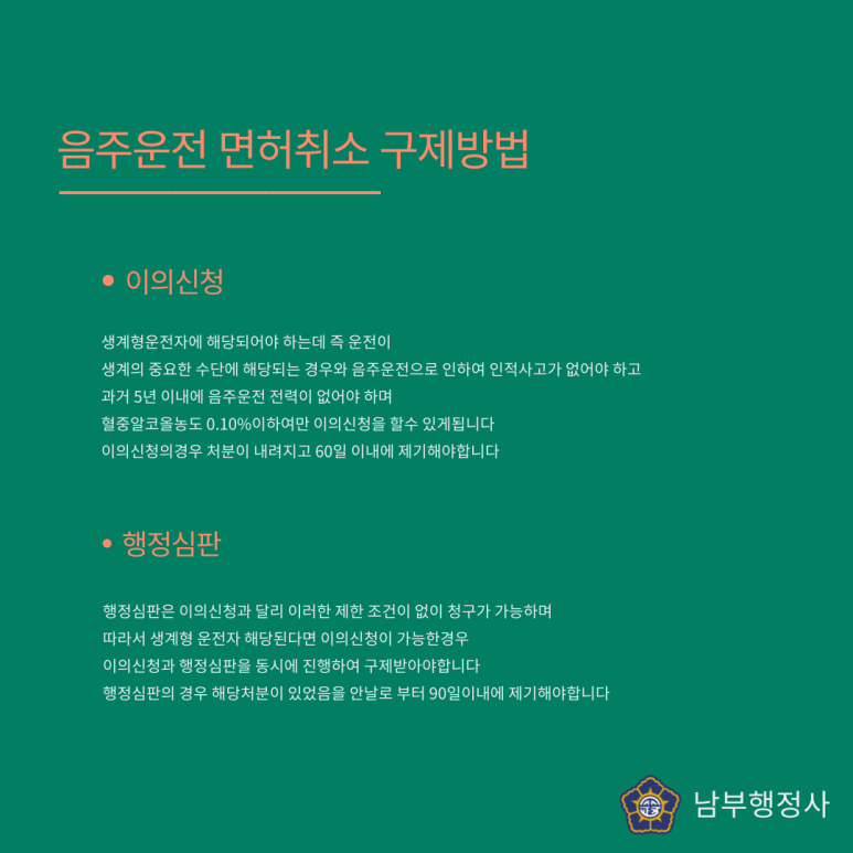 음주운전으로 경찰조사가 끝난 후 면허취소결정통지서를 받게 되면 구제신청 방법으로 이의신청과 행정심판청구를 할 수 있습니다. 이의신청은 해당 경찰청에 제출해야 하며 몇 가지 조건이 갖춰져야 기각되지만 혈중알코올농도 0.1% 이하여야 하며 5년 이내에 음주운전으로 인한 사고가 있어서는 안됩니다. 그러나 행정심판청구는 세종시에 있는 중앙행정심판위원회가 하는 것으로 갖춰야 할 조건이 없어도 누구나 신청할 수 있으며 이의신청은 결정통지서 수령 후 60일 이내에 행정심판청구는 90일 이내에 신청해야 합니다.
