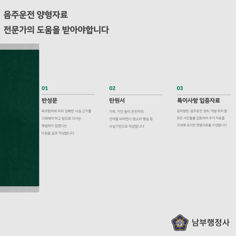 음주운전으로 경찰의 조사를 받기 전 또는 이미 조사를 받았다면 음주운전으로 경찰조사의 양형자료를 철저히 준비하여 제출하는 것이 중요하지만 음주운전에서 경찰조사의 양형자료는 선처를 원하는 목적으로 이루어지는 서류이기 때문에 전문가의 협조를 받아 진행하는 것이 효과적인 결과를 낳을 수 있는 요소 중 하나입니다.우선 자신의 잘못을 인정하고 앞으로 다시는 재범하지 않겠다는 다짐의 반성문을 작성하고 운전자의 선처를 바라는 가족, 지인들의 탄원서 등이 필요합니다.또한 처분경감을 위해 본인의 경제사정, 적발된 위치, 경위 등 모든 사안을 파악하고 유리한 음주운전 양형자료를 구성해 구제 가능성을 높여야 합니다.