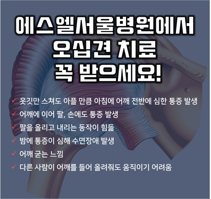오십견 증상 1. 아픈 증상과 관절의 운동 범위가 제한됩니다. 2. 밤에 아픈 증상이 더 심해져 잠을 못 이루는 경우가 발생합니다.3. 팔의 운동 범위가 제한되어 일상생활에 어려움을 겪을 수 있습니다. 4. 타인의 도움을 받아 팔을 들려고 해도 일정 범위를 넘을 수 없습니다. 5. 자연스레 아픈 증상이 개선될 수 있지만 일반적으로 아픈 증상이 완화되는 데 6개월에서 2년 이상의 시간이 필요합니다.