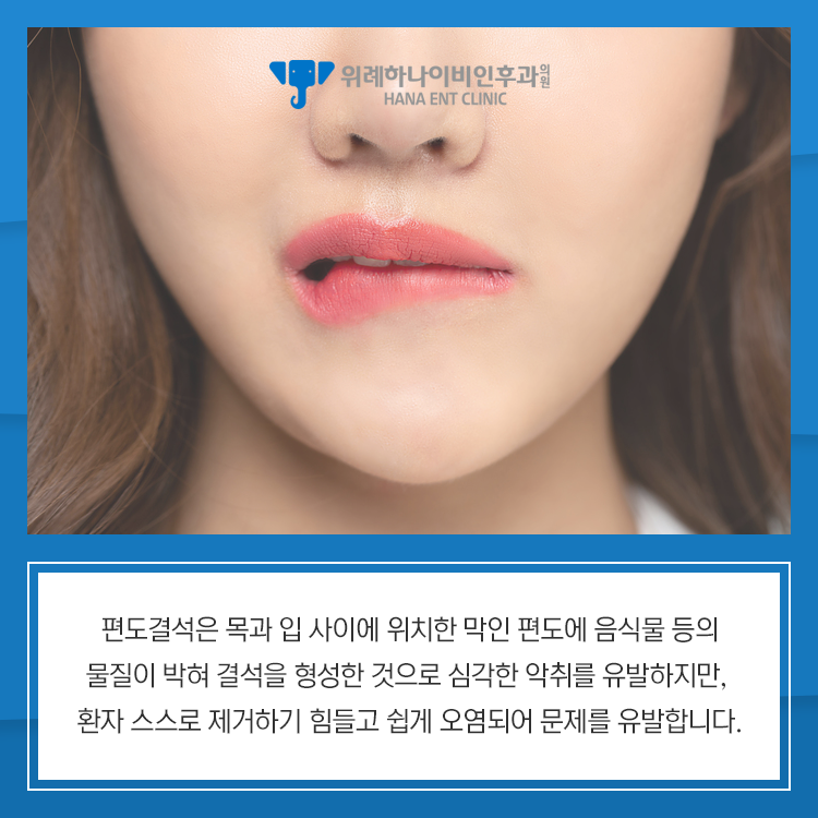 일상 생활에서 나에게서 강렬한 입냄새를 자각하신 적이 있나요? 구취는 다양한 원인으로 일어나는데 그 중 큰 비중을 차지하는 것이 편도 결석입니다. 편도결석이란 입과 목 사이에 있는 편도에 음식물 같은 물질이 박혀 결석 모양을 이루는 것을 말합니다. 필연적으로심각한악취를유발하게되고,이러한악취가환자의구취로이어지기때문에불편할뿐만아니라사회적인관계를만들어가는것에도큰영향을미치게됩니다. 또한, 이러한 결석은 환자가 스스로 제거하는 것이 매우 어려울 뿐만 아니라 만지면 편도가 더러워질 수 있기 때문에 적절한 내원이 필요합니다.
