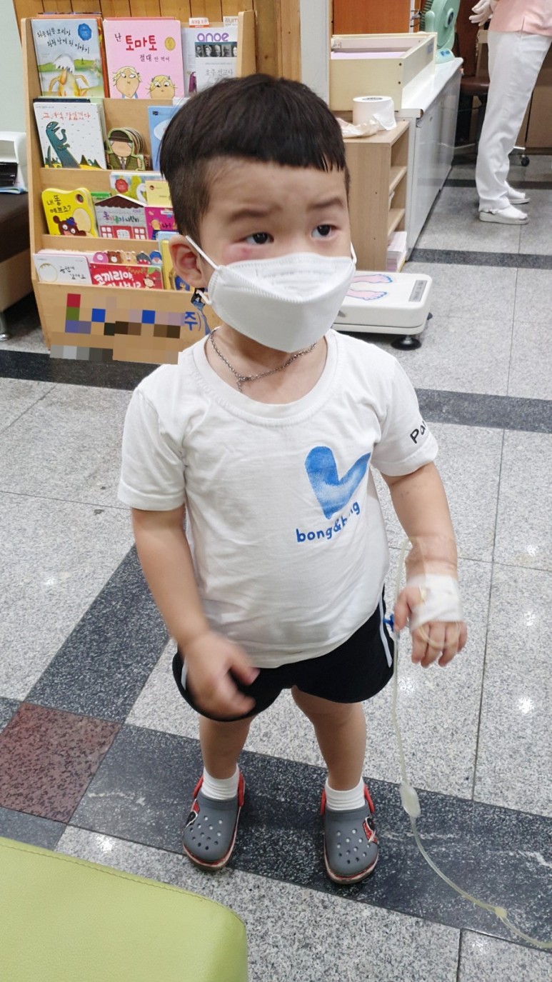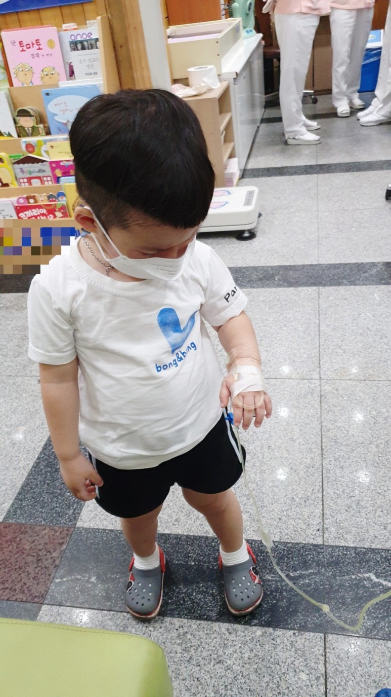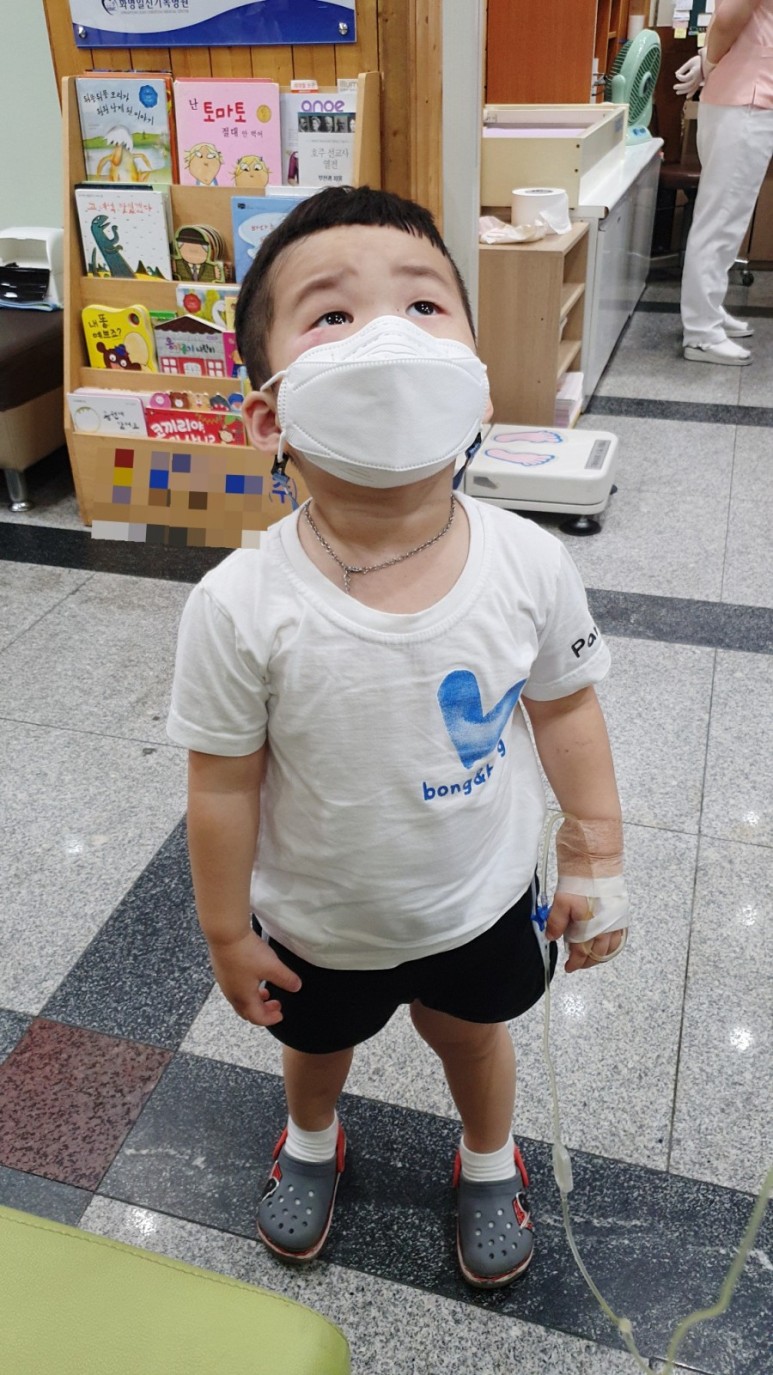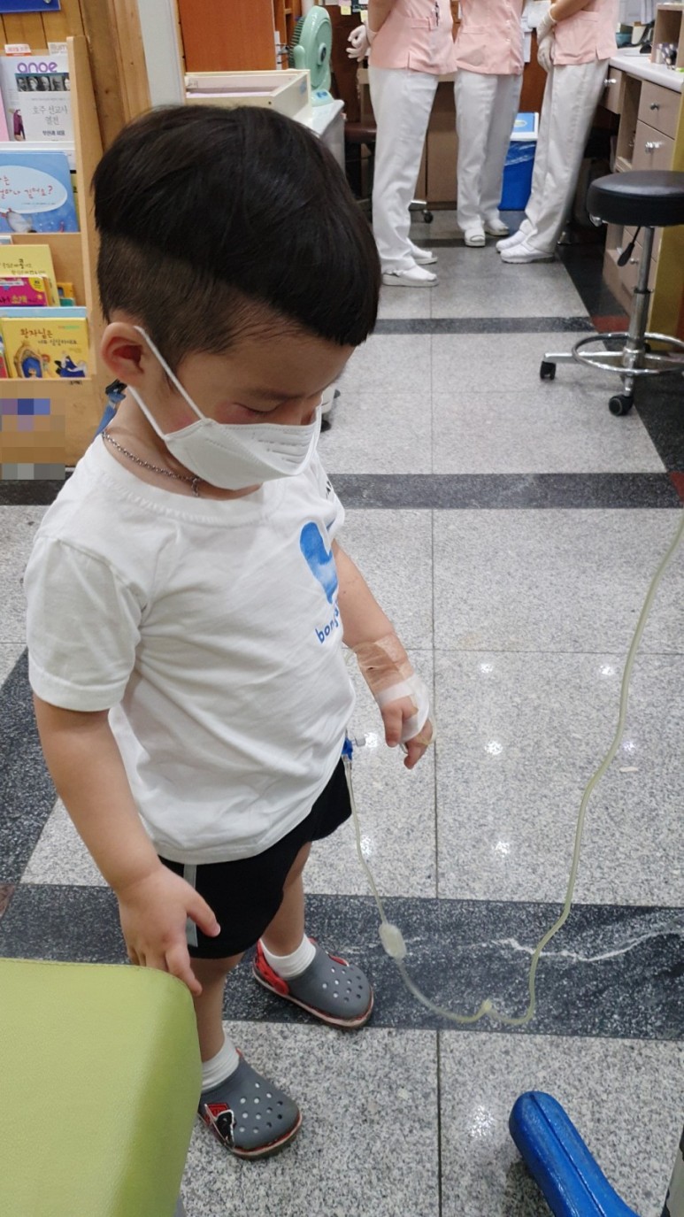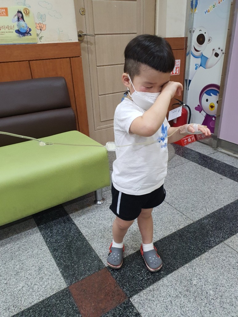 편도염 증세 39.5도의 고열로 엉덩이 주사를 맞고 웃고 링거를 맞을 때는 울지 않았는데 팔로 온몸에 힘을 줘 유아 얼굴의 열꽃이 더 크게 벌어진다.깜짝 놀랐어요ㅜㅜ