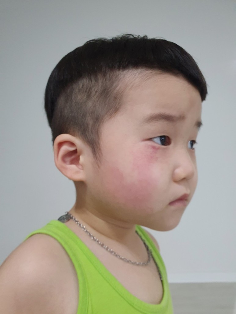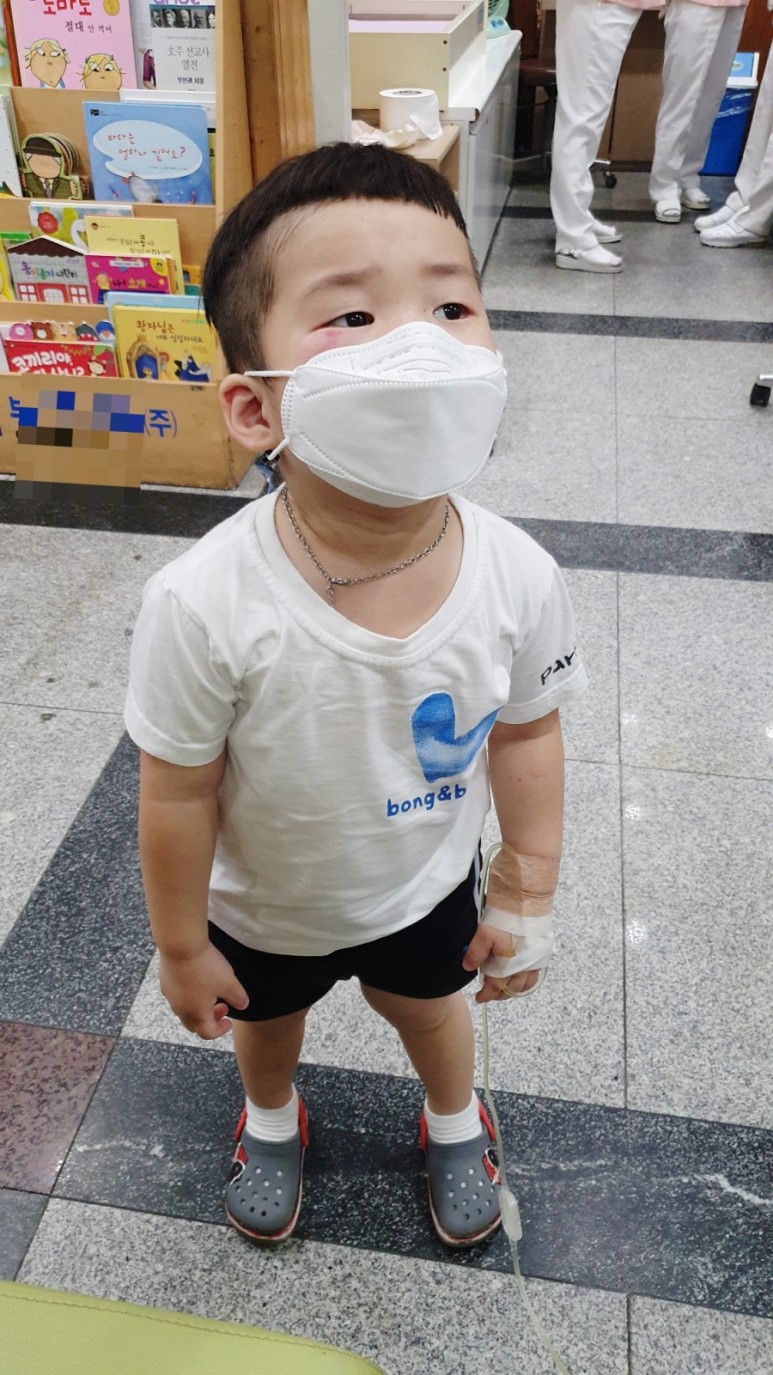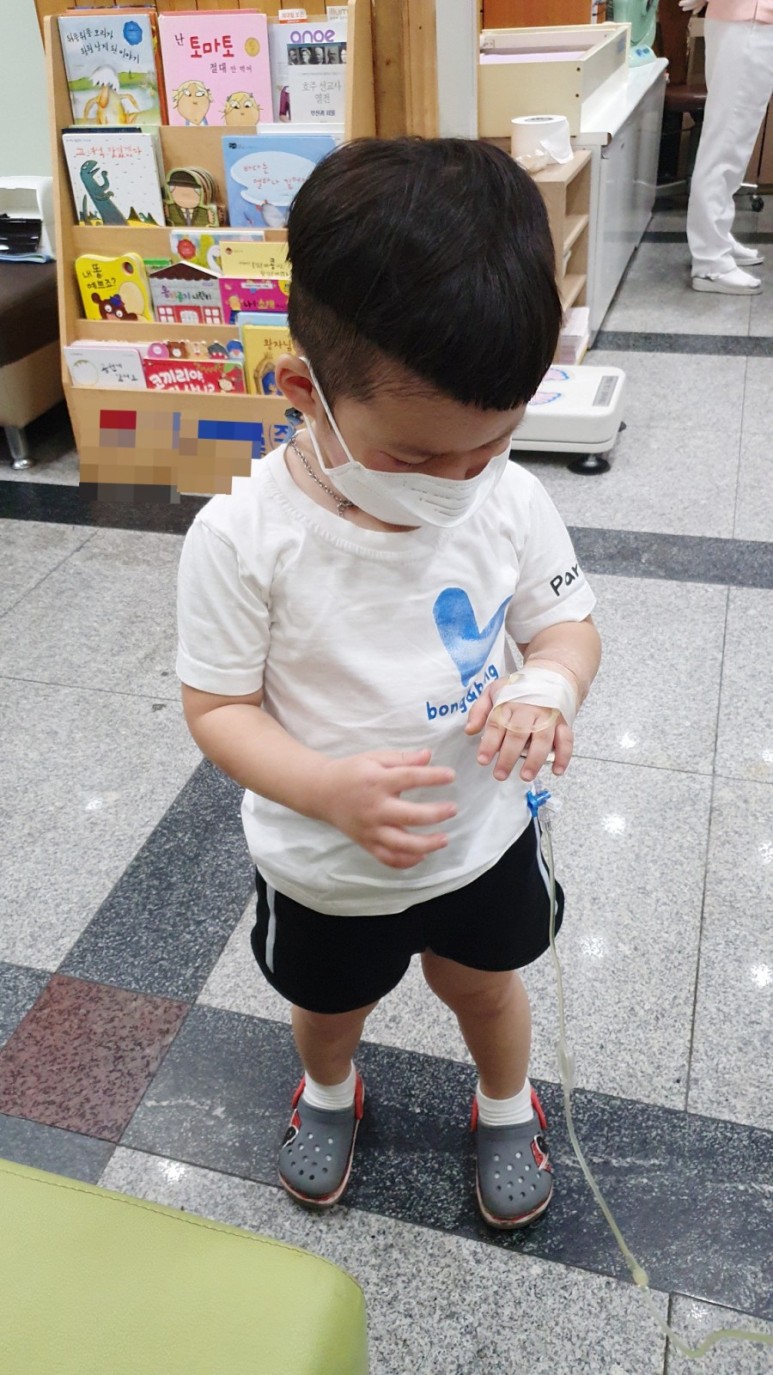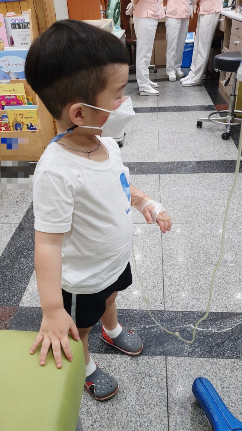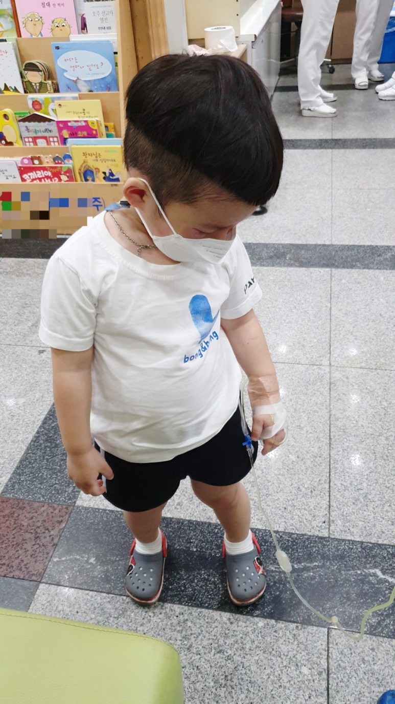 편도염 증세 39.5도의 고열로 엉덩이 주사를 맞고 웃고 링거를 맞을 때는 울지 않았는데 팔로 온몸에 힘을 줘 유아 얼굴의 열꽃이 더 크게 벌어진다.깜짝 놀랐어요ㅜㅜ