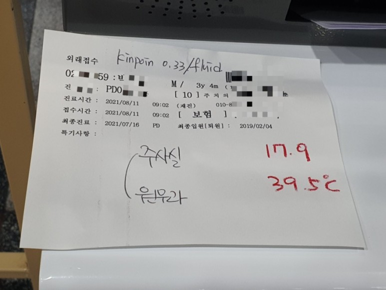 아이의 얼굴에 열꽃이 조금 표시될까 말까 해서 이상하게 보았어요. 저쪽에 표시가 없더라고요 첫 번째 환자로 목이 붓고 편도염 증상이라고 해서 약을 처방 받았습니다. 39.5도니까 열이 내리는 주사 맞고 가라고 하더라고요. 더 아프지 않으려고 링거도 맞으러 갔어요.^^;;;