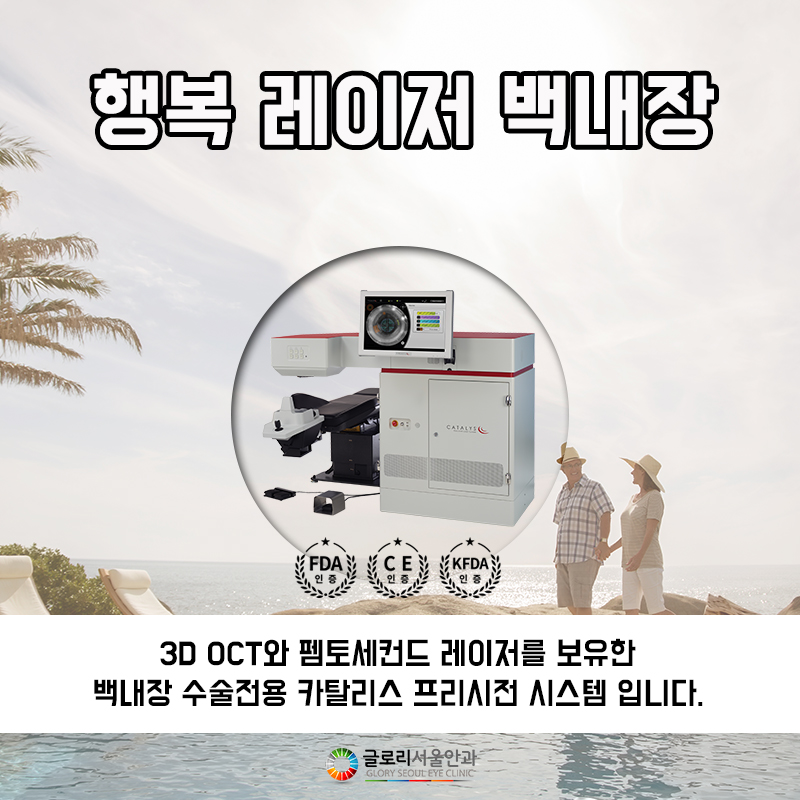 최근 행해지고 있는 백내장 수술은, 3DOCT와 팸터 세컨드 레이저 기능을 가지는 백내장 수술 전용 장비인 카타리스 시스템을 기반으로 행해지고 있습니다. 과거에는 수술 칼과 초음파 장비를 이용하는 수기 방식의 수술을 진행하는 것이 일반적이었으나 아무래도 집도의의 손으로 직접 다루는 수술이기 때문에 손이 흔들리는 등 예상치 못한 돌발 상황이 발생하거나 특히 백내장 수술 시간이 오래 걸리고 통증이나 회복 기간에도 영향을 미칠 수 있다는 단점이 수반될 수밖에 없었습니다.이러한 수기방식의 단점을 보완한 것이 레이저 백내장 수술이지만 카타리스 시스템은 전 세계 신뢰할 수 있는 백내장 전문가들의 공동연구에 의하여 개발된 장치로 FDA, KFDA, CE로부터 모두 승인받은 안전성이 입증된 장치라고 할 수 있습니다.
