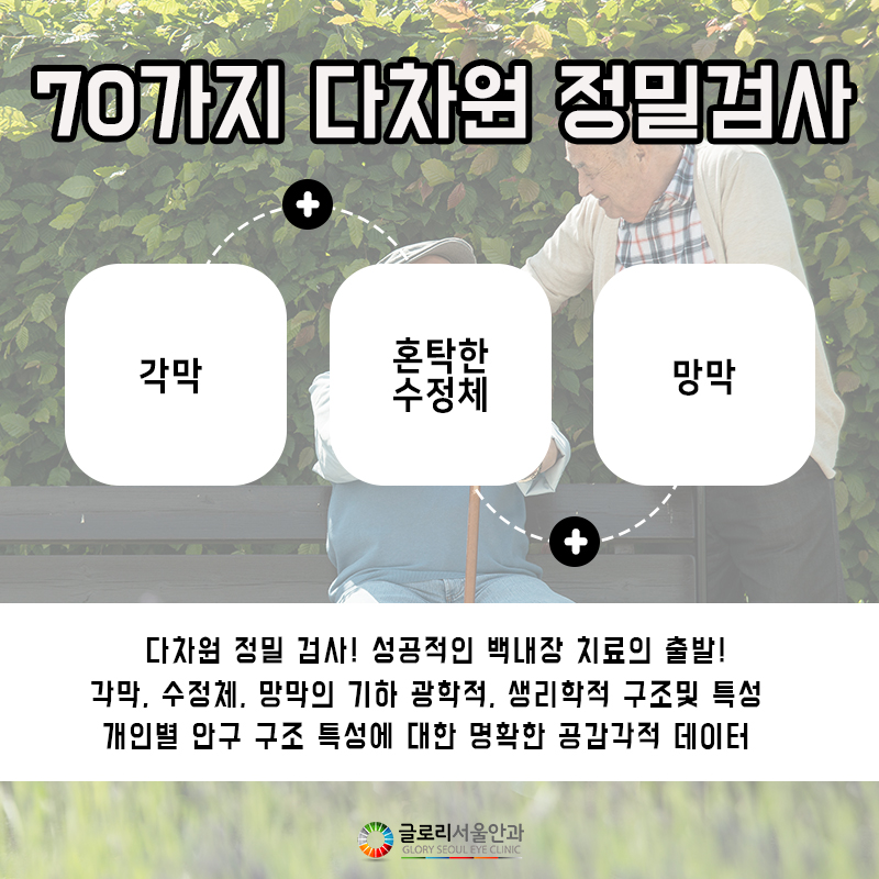수술 전에는 반드시 체계적인 정밀검사와 상담을 통하여 현재 자신이 가지고 있는 백내장의 원인, 증상의 정도, 진행 단계에 맞는 수술 방법을 찾아내는 것이 중요하다고 할 수 있습니다. 본원은 7단계의 70여 가지의 다차원 정밀검사를 통해 개인별 안구구조 특징에 대한 명확한 공감각적 데이터를 도출하고 있으며 그에 맞는 솔루션을 모색하고 있습니다.통증이나 회복기간, 백내장 수술시간 등에 대한 부담 때문에 증상을 방치하거나 치료를 받지 않을 경우 녹내장 등 합병증은 물론 심할 경우 실명에 이를 수 있다는 점을 반드시 명심하고 눈에 이상이 나타나면 바로 안과 진료를 받는 것이 바람직하다.