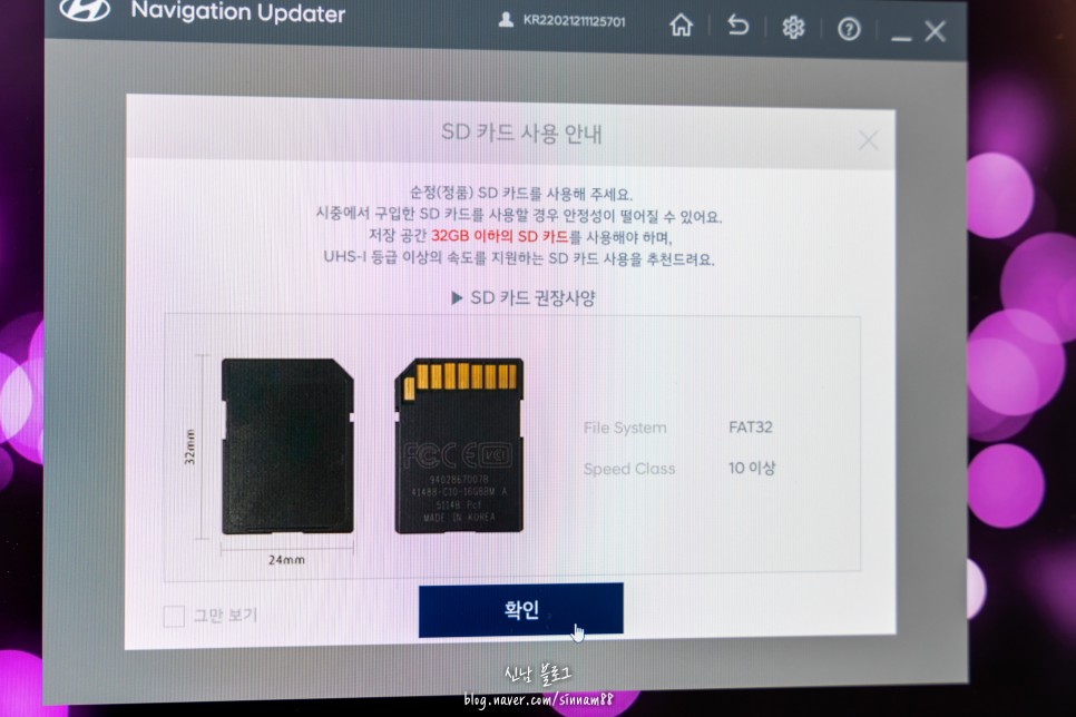 sd카드 사용안내항목이 나와있습니다. 정품 sd카드를 이용해 달라고 요청하고 있습니다만, 실은 인터넷에서 구입한 sd카드를 사용해도 괜찮습니다. 기본적으로는 차에 달고 있는 것을 빼 왔을 경우는 걱정하지 않고,<확인>을 눌러 주세요.