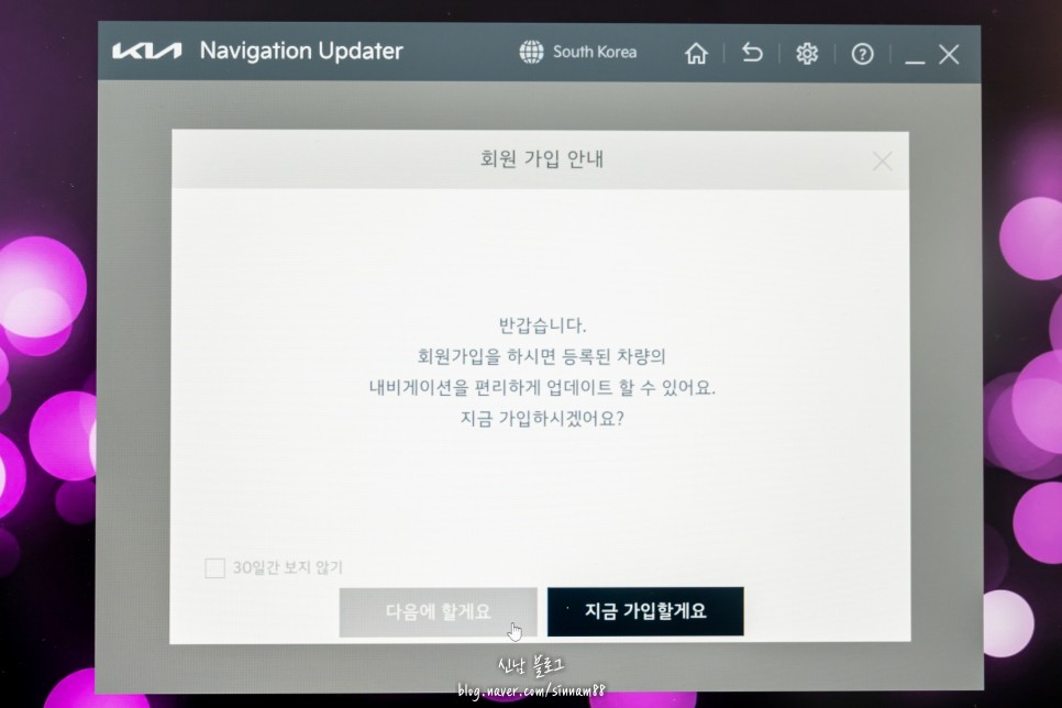 <회원가입 안내>라고 하면서 차량을 등록하시면 기어 네비게이션 업데이트가 편리합니다. 회원가입을 하나마나다 사실은 똑같아요. 다음에 또 할게요> 를 선택합니다.