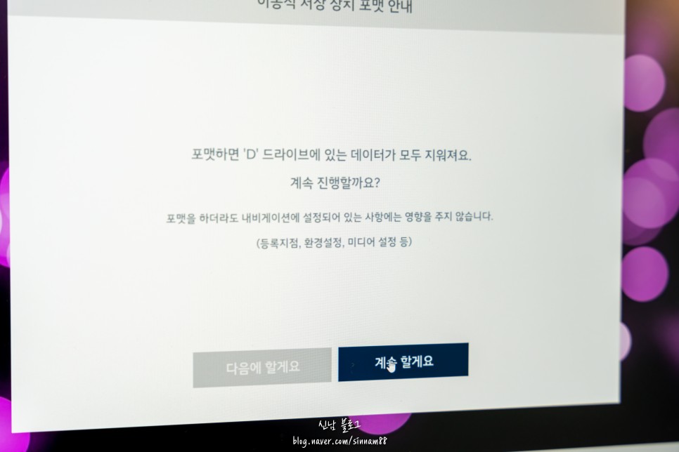 포맷을 하면 데이터가 다 사라진다는 안내와 함께 진행이 되는지 물어볼게요 <계속합니다>를 선택해 주세요.