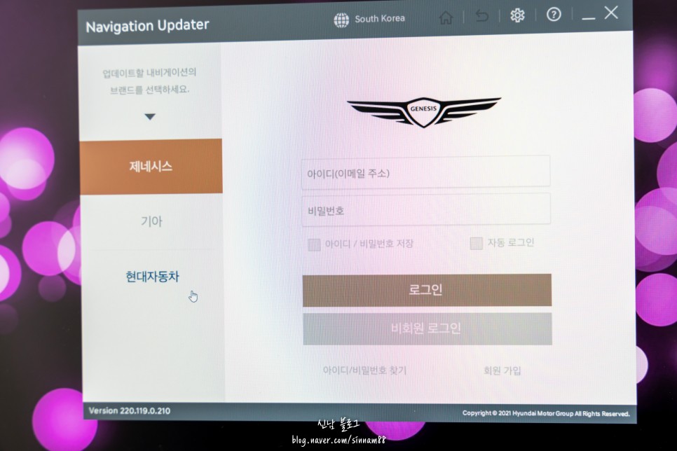 설치된 navigation updater 소프트웨어를 실행하면 가장 먼저 제네시스 항목이 선택되어 있습니다. 이 부분을 좌측에 있는 항목의 ‘기어’를 눌러 변경하세요.