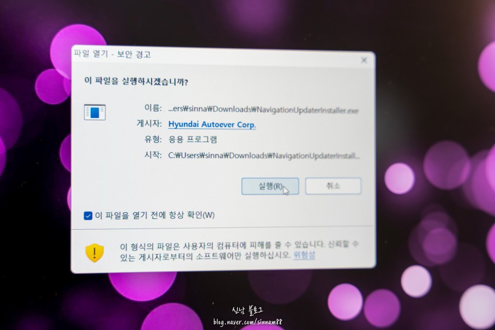 다운로드 받은 파일을 실행하면 보안 경고가 나옵니다. 이것은 설치 파일 때 반드시 나오는 항목이므로 걱정 마시고 실행을 누르시기 바랍니다.