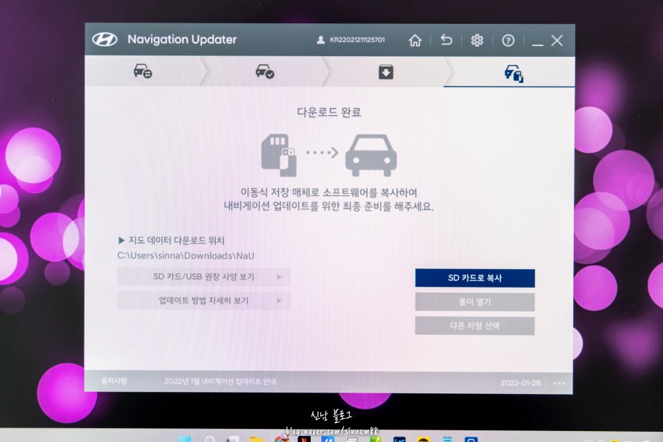 다운로드 완료라는 항목이 뜨면 sd카드로 복사를 누르기 전에 PC에 sd카드를 연결해야 합니다. 소지품으로 필요했던 리더기를 컴퓨터에 꽂고 sd카드를 PC와 연동하세요.