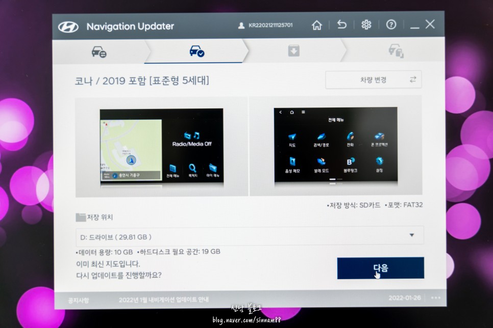 그래서 기아차를 구입할 때 정품 네비게이션을 많이 탑재해서 사용하고 있는데 고가의 네비게이션 옵션을 선택하신 분은 인터넷 연동이 되어 언제든지 서버에 최신 버전의 네비게이션 업데이트가 올라오면 자동으로 받을 수 있지만 저처럼 조금 저렴한 가격의 옵션을 선택하신 분들은 지금도 sd카드를 이용하여 수동 업데이트를 해야합니다.
