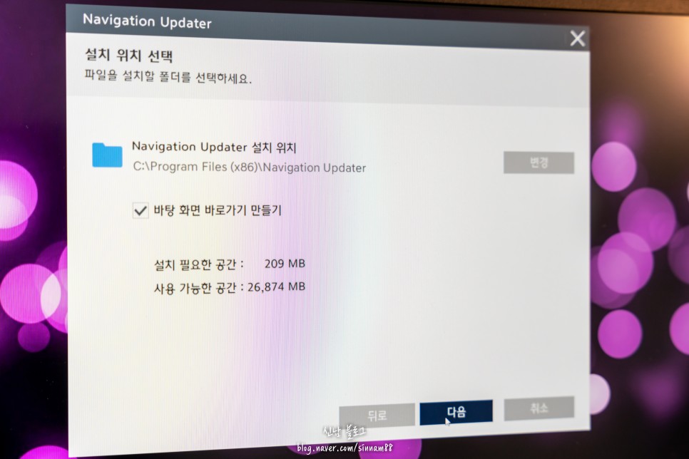 처음에는 sd카드에 바로 저장되는 게 아니라 PC 하드디스크에 먼저 저장이 됩니다 하드 디스크 용량이 충분히 확보되었는지 확인하고 다음을 누르세요. 내비게이션의 용량은 버전마다 다르지만, 최소한 25그램 b 정도 필요합니다.