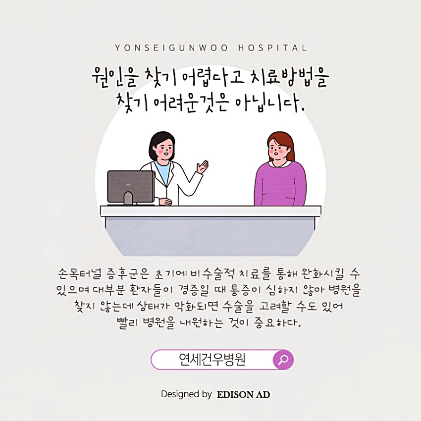 손목터널증후군질환은 휴식과 물리치료 등으로 충분히 호전을 기대할 수 있는 질환입니다.
