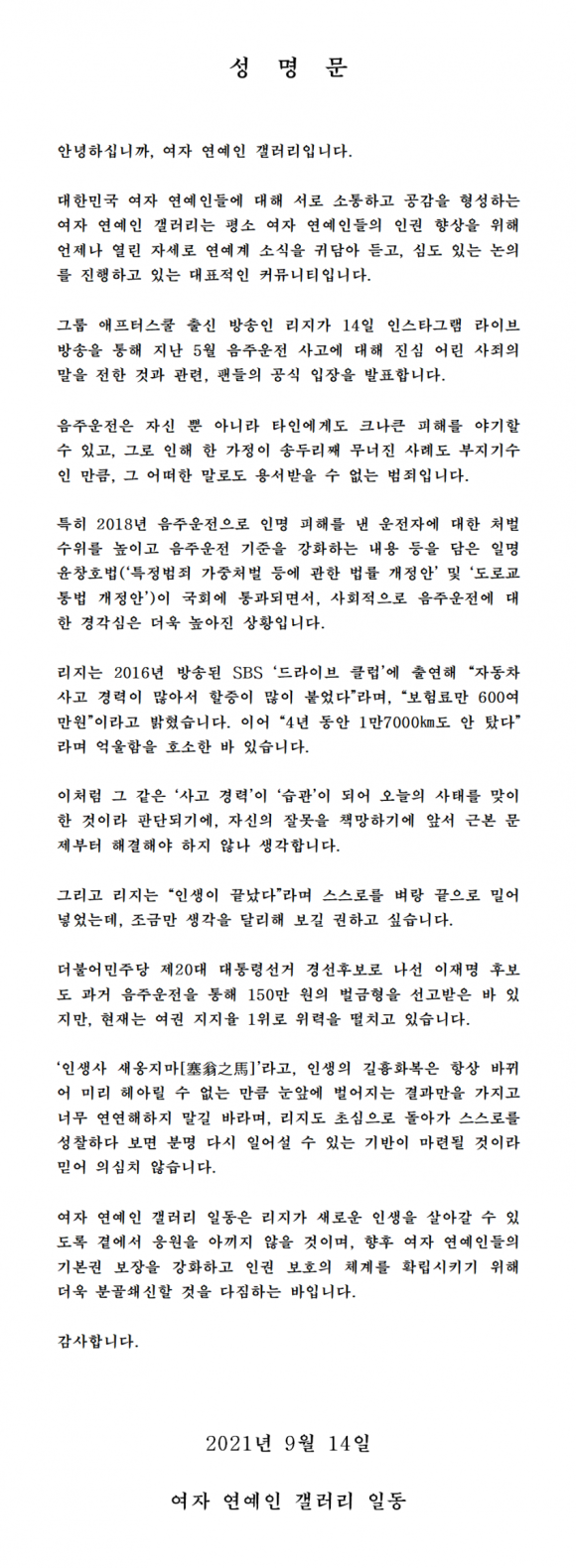 여성 연예인 갤러리에서는 성명서를 냈어요.
