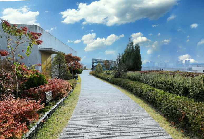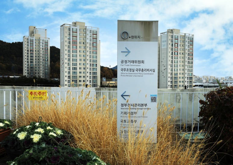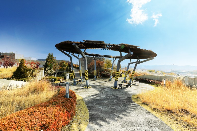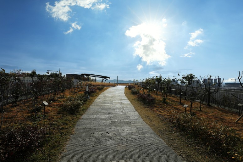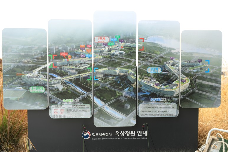 정부세종청사 옥상정원은 총 55만㎡부지에 연면적 63만㎡의 건축물을 길게 늘어뜨린 연도형으로 유실수, 허브류, 약용식물 등 218종 117만여 그루의 식물이 자라고 있으며 억새길, 등나무길, 넓은 길 등 3개의 주제도도 조성하여 자연과 조화를 이룬 도심 속 공원청사로 자리매김하고 있다고 합니다.
