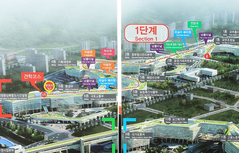 태극기가 있는 완만한 전망대에 오르면 6동을 출발해 그동안 걸어온 정부세종청사 옥상정원의 길이 한눈에 들어옵니다.