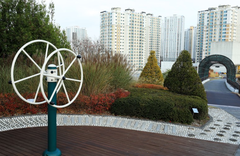 중간중간에 운동기구나 벤치, 그늘진 공간을 두고 휴식과 담소를 나눌 수도 있습니다.