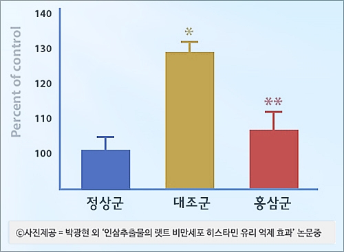 전북대 박광현 박사 연구팀은 알레르기 물질에 노출된 쥐를 둘로 나눠 한 그룹에만 홍삼 추출물을 투입했습니다. 그 후 그룹별 히스타민(비염, 축농증 유발인자) 분비량을 비교하였습니다.