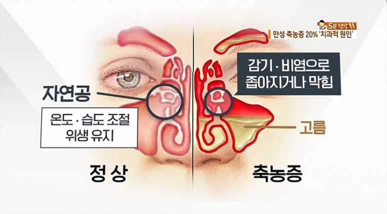 코 안쪽에는 부비강이라는 빈 공간이 있어요 코, 눈, 치아 등이 연결된 통로로 환기와 노폐물 배출에 관여합니다. 또한 뇌를 외부 충격으로부터 보호해 줍니다. 여기에 염증이 생기면 내부가 막혀서 환기가 잘 안되요. 금방 세균이 대폭 증가하여 가래, 코막힘, 두통, 만성 기침 등을 유발합니다만. 바로 ‘축농증’입니다.