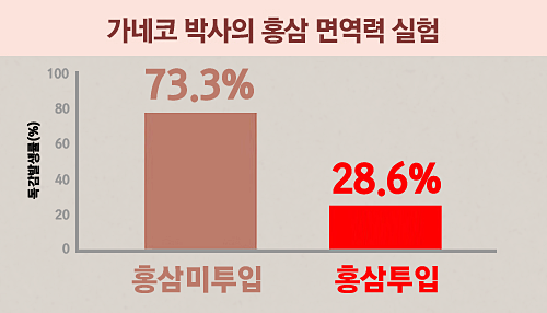 그 결과 가짜 약 섭취군은 73.3%나 독감에 걸렸지만 홍삼 섭취군은 그보다 4배가량 낮은 28.6%만 발병한 것으로 나타났습니다. 이를 확인한 연구팀은 “주요 성분이 면역력을 높였기 때문”이라고 설명했습니다.