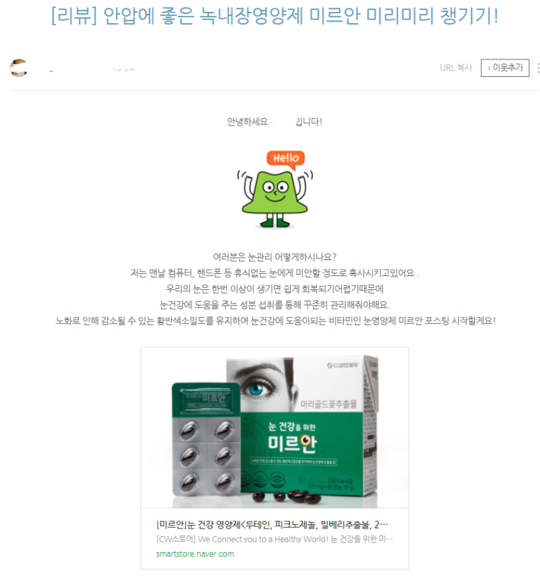 오늘 약국에서 만난 손님과의 대화다. 손님이 녹내장 약을 금방 발견해서 너무 놀랐다 녹내장 치료약이 나왔다면 이건 완전 노벨 의학상 수상감이야 그럴 리가 있나 싶어 밀안을 네이버에 검색해 봤다. 밀루안이라는 제품명이 맞았지만 역시 흔한 루테인이었다. 그런데 무슨 녹내장? 하고 더 검색해 보았더니 블로그에서 녹내장 영양제라고 선전되고 있었던 것이다. 루테인은 분명히 눈 건강에 도움이 되는 영양 성분이다. 하지만 과장 광고가 너무 많아서 정확하게 알고 먹길 바란다.