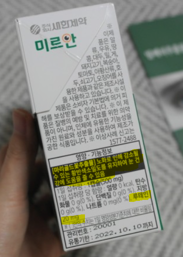 그렇다고 루테인이 효과가 없다는 건 아니다. 녹내장 환자는 시력이 나빠질 수 있으므로 최대한 다른 요인(예:노화)으로 시신경이 손상되는 것을 막는 것이 좋다. 그래서 녹내장, 백내장 등 안과 질환 환자에게 루테인 복용을 권하는 것이다. 루테인의 효능은 노화로 감소하는 황반색소밀도를 유지하며 눈 건강에 도움을 준다. 황반은 망막 중심부에 위치하여 시력의 90%를 담당하는 중요한 부분인데 황반 구성성분인 루테인을 복용하면 황반색소밀도를 증가시켜 황반의 시각형성 기능을 도와 시력 유지에 도움을 준다. 루테인 광고를 하려면 이런 효과를 내세우는 게 바람직하다.건강기능식품은 주원료가 중요! 부원료에 속지 말자.주원료인 메리골드 꽃뿐만 아니라 밀안은 특허를 받은 유럽산 천연 부원료인 빌베리 추출물(이탈리아 인데나사), 피크노제놀(이탈리아 홀파크사, 프랑스 해안의 소나무껍질 추출물) 두 가지가 안압을 낮추는 데 도움을 주기 때문에 지금까지 먹어온 루테인과는 조금 다른 것 같습니다.몇몇 네이버 블로그 밀앤 제품 홍보 블로그의 글을 보면 이렇게 적혀 있다. 음, 네, 좋아요. 빌베리추출물과피크노제놀모두뛰어난성분입니다. 그러나 안압을 낮추는 데 도움이 되는 충분한 함량이 들어 있는가? 이건 알 수 없지 않은가! 그런데도 각종 sns에서는 그토록 검증되지 않은 광고로 소비자를 현혹하고 있다. (이 글을 쓰는 이유 -_- )