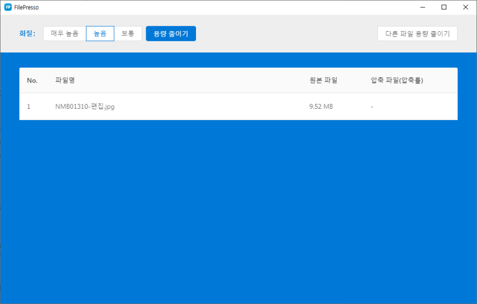커피 이름을 연상시키는 File Presso 실행 화면 입니다. 사용법은 매우 심플합니다. 용량을 줄이고 싶은 파일을 선택하거나 위쪽 창으로 드래그 합니다.