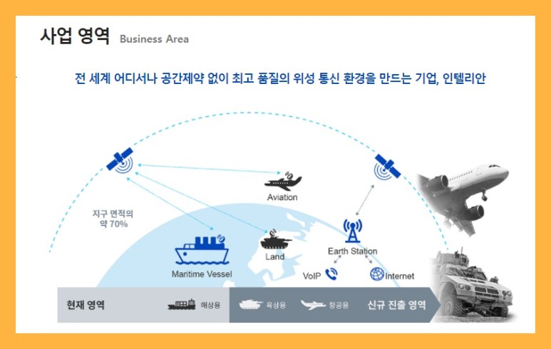 해상용 제품에서 육상용, 항공용 제품으로 매출을 확대하려고 함.육상용 위성통신 안테나는 차량 접근이 어려운 오지와 피해지역, 그리고 해외에 파견된 군부대의 통신망 개설을 위해 사용된다.-2019년부터 육군에 육상용 운반형 위성통신 안테나를 공급하고 있다.