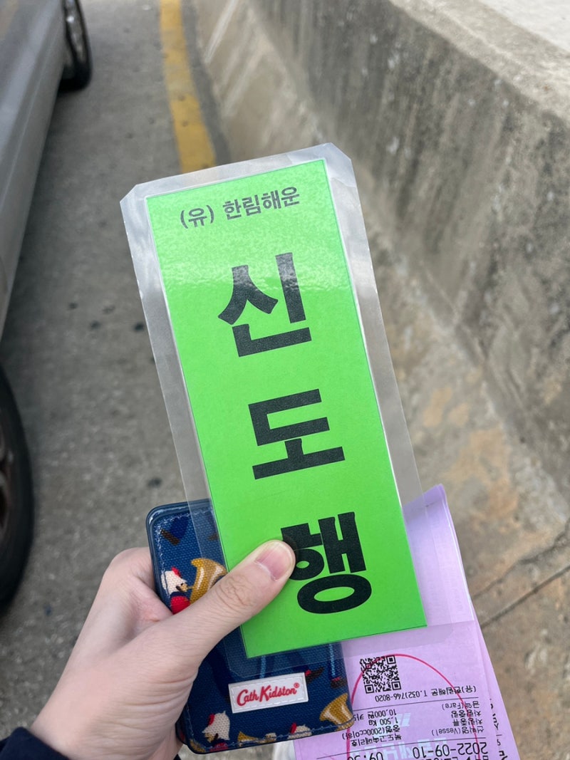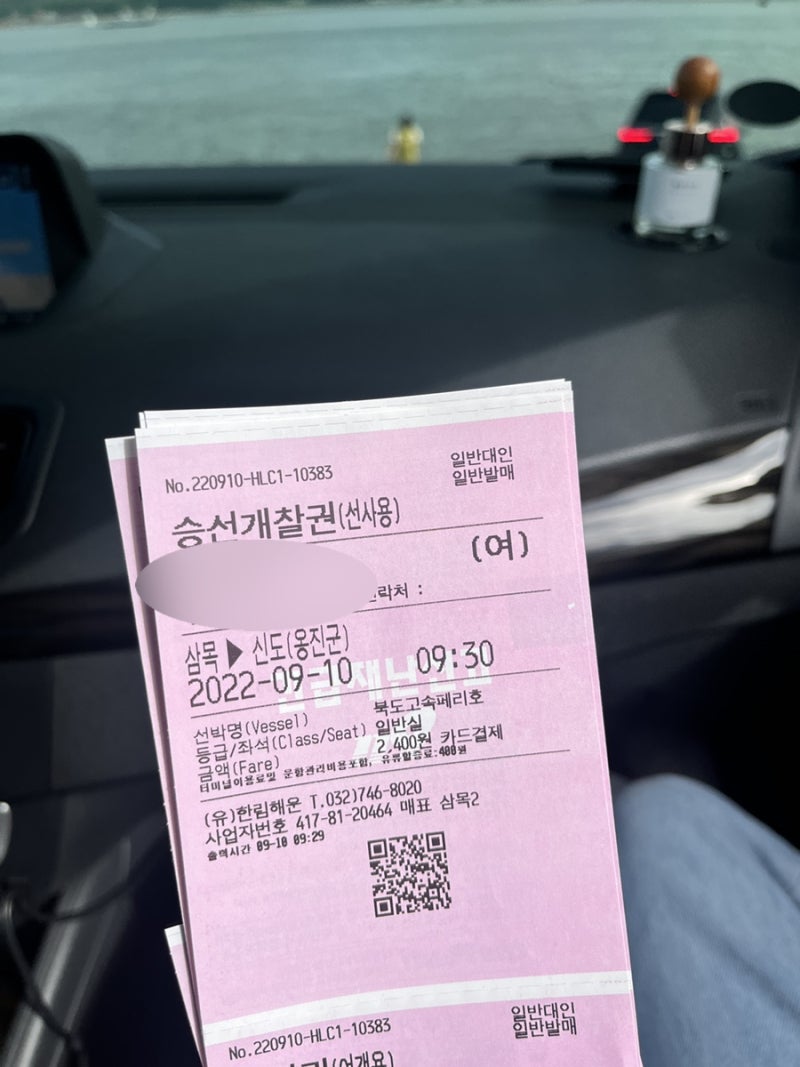 아, 그리고 미키여객터미널에서 탈 배는 미키에서 출발해서 신도→장봉도로 가는 배입니다! 그래서 발권할 때 꽉 신길로 간다고 말씀드려야 해요.:) 보니까 장봉도로 가는 차가 먼저 들어가고 그다음에 신도로 가는 차가 배로 들어가 있더라고요! 그래서 이렇게 발권할 때 나눠주시는 ‘신도행’을 운전석 앞 와이퍼에 끼워 표시해놔야 해요!