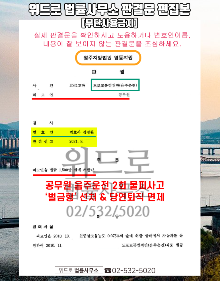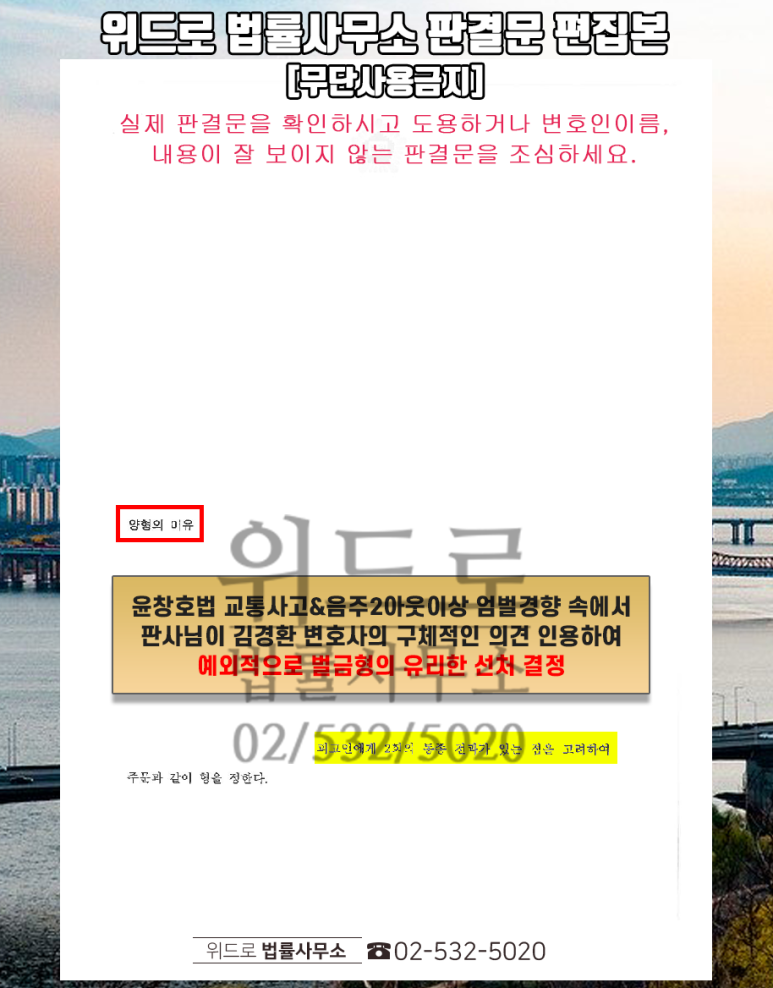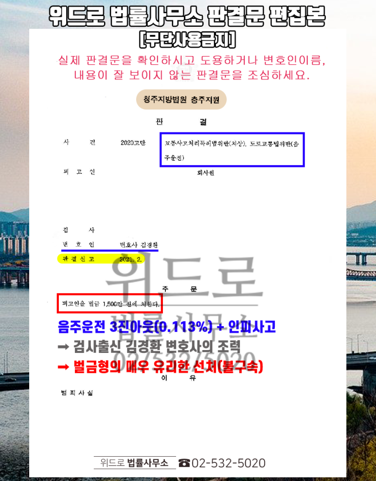 최근에는 더욱 법이 엄격해지고 실형을 주로 받고 근절하기 위해 노력하고 있기 때문에 사실상 충주 음주운전 삼진아웃 사건으로 벌금형을 받는 것은 결코 쉽지 않은 사안입니다. 또 교통사고처리특례법 위반 사안까지 있어 죄질이 더 나빴지만 법률대리인의 협조로 매우 유리한 선처결과를 얻을 수 있었던 사례입니다.