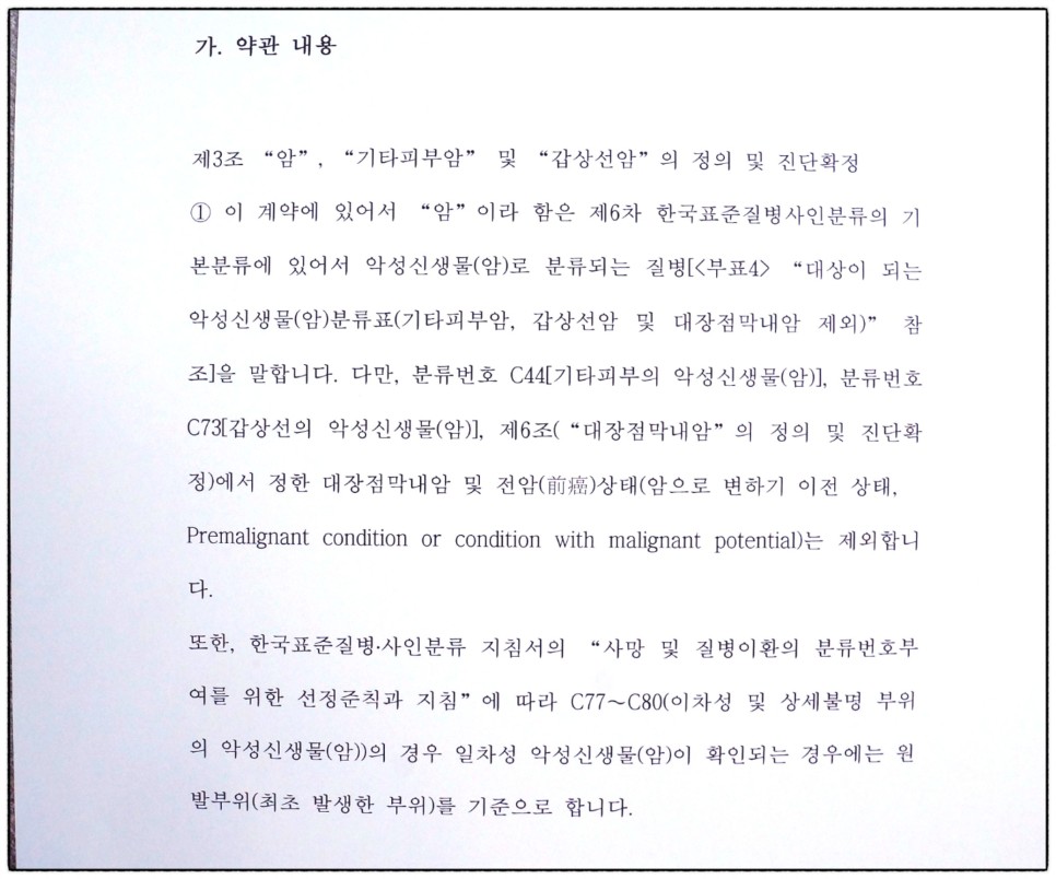 보험회사는 당연히 소액암 기준의 갑상선암 보험금을 지급하려고 할 것입니다. 왜냐하면 약관에서 최초로 발생한 부위를 기준으로 보상한다고 규정하고 있기 때문입니다.