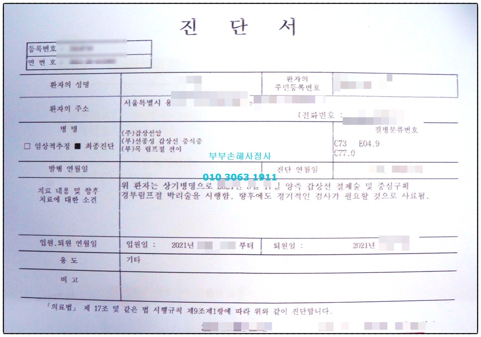 진단서의 내용을 보면 피보험자는 갑상선암 및 목 림프절 전이라는 진단명이 기재되어 있는 것을 알 수 있습니다.
