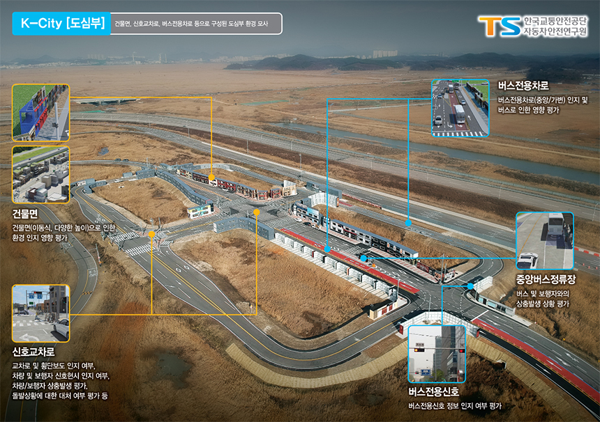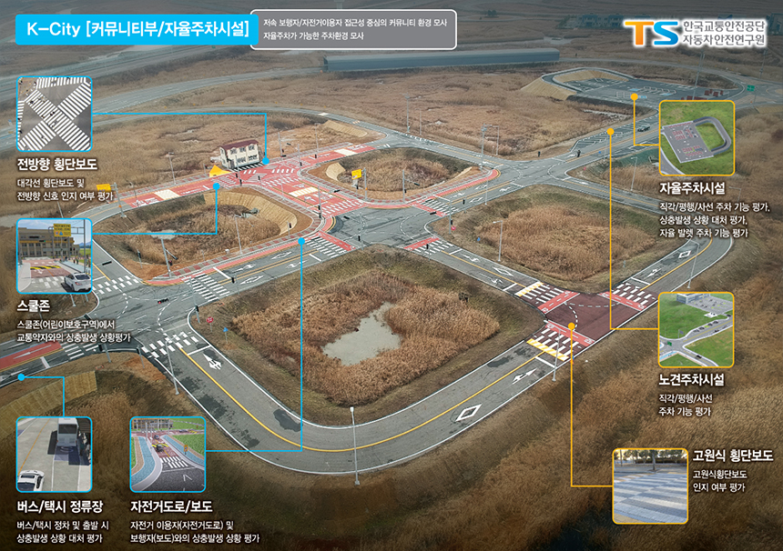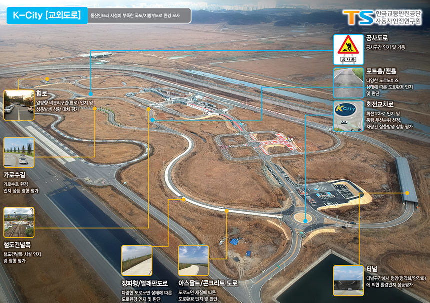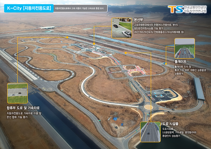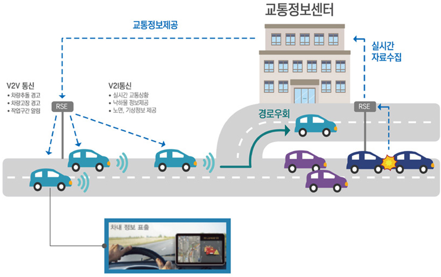 앞에서 설명한 바와 같이 자율주행 상용화를 위해서는 자동차 기술뿐만 아니라 C-ITS 기술이 반드시 따라야 합니다. 차량과 도로 시설에 통신 기술을 도입함으로써 교통 상황과 위험 정보를 제공하는 C-ITS 기술이 적용된 도로를 스마트 도로라고 부릅니다. C-ITS 기술은 첨단 신호 제어 시스템, 노변 기지국, 스마트 돌발 상황 감지기, 차선 제어기, CCTV 등의 장비들로 구성되어 있습니다.