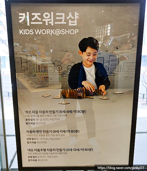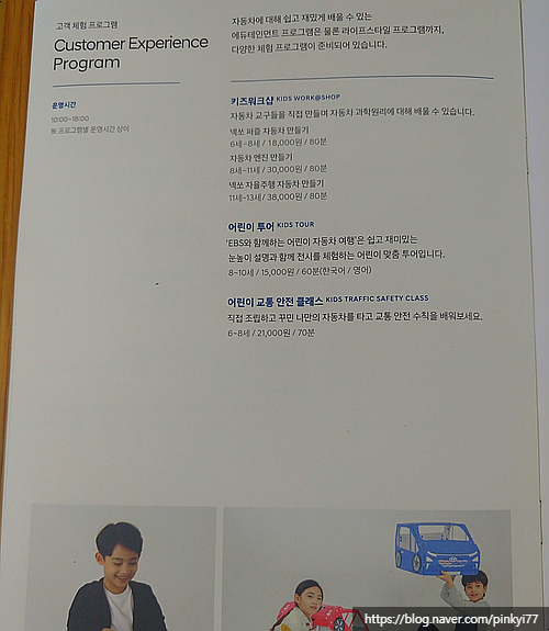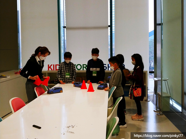 오늘 수업 인원은 5명! 수업 시작 전 선생님과 간단한 인사 시간을 보내고, 전시장에 전시된 실제 ‘넥터’ 자동차를 보며 수업 교실로 가겠다고 했다. 체험프로그램을 예약하면 아이만 들을 수 있는 수업이므로 부모에게는 카페 이용권을 준다. 또 상설투어 프로그램의 어린이 이용권(유효기간 6개월)도 제공된다. 이들은 80분 수업이니 끝나는 시간에 교실로 오면 된다고 말했다.