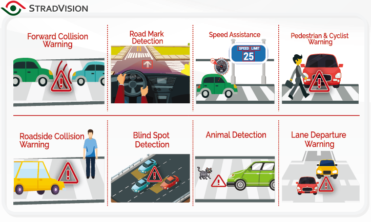 이미 국내외 자동차 회사들이 자율주행 Level 0~2에 해당하는 ADAS 기능을 탑재한 차량을 양산하고 있습니다.전방추돌경고(Forward Collision Warning), 차선이탈방지(Lane Departure Warning), 스마트크루즈 컨트롤(Smart Cruise Control), 고속도로 주행보조(Highway Driving Assist) 등 우리의 실생활에서 접할 수 있는 이러한 주행안전기능이 ADAS기능입니다.이러한 ADAS 기능을 구현하기 위해서는 차량의 카메라 센서로부터 객체 인식, 차선 인식, 신호기 및 표지판 인식, 거리 추정 등이 필요하며, 이를 가능하게 하는 것이 스트래드 비전의 SVNet 소프트웨어입니다.