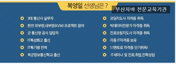그렇기 때문에 it는 기술직에서 실습수업이기 때문에 부산 JAVA학원을 선택할 때 it학원의 규모, 얼마나 오래된 교육기관인지, 자격시험센터가 있는지, 진로, 취업자격준비, 그리고 취업연계, 그리고 체계적으로 전문상담사가 상담해주는지, 관리해주는 교육기관인지 모두 비교해야 합니다.