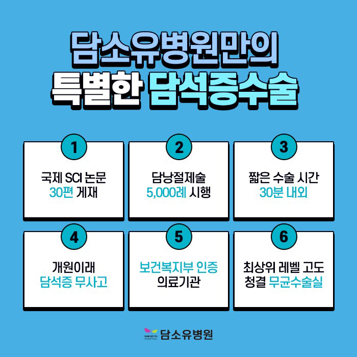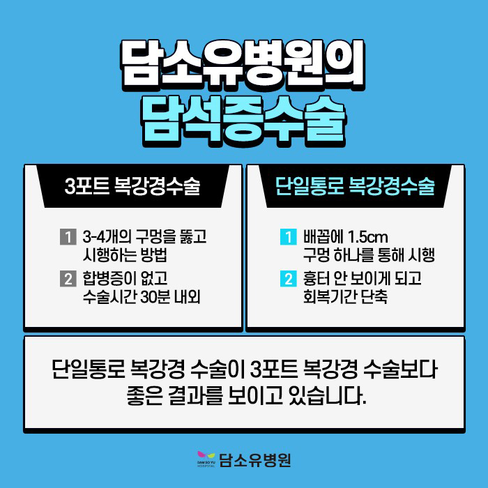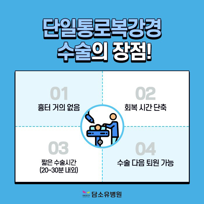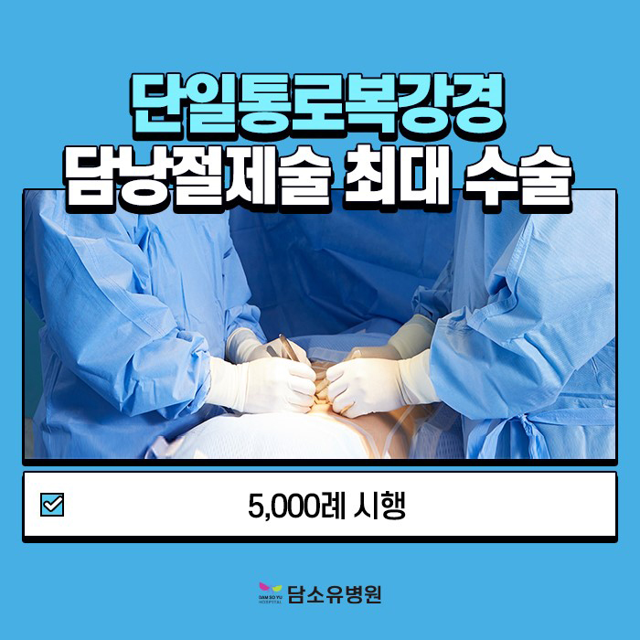 일반적으로 복강경을 통해 3~4개의 구멍을 뚫어 진행하지만 담소유병원은 단일 통로의 복강경으로 한 개의 구멍을 뚫어 진료하게 됩니다.따라서 일반 복강경에 비해 통증 감소와 흉터 걱정을 줄일 수 있다는 점이 가장 큰 장점입니다.입원 기간도 짧아질 수 있고 회복 속도도 더 빨라질 수 있습니다.이는 의료진에게 어려운 술기 중 하나이므로 반드시 담소유 병원처럼 어느 정도 경험을 가진 집도의에 의해 시행되어야 합니다.담석증 수술 실력은 진행 시간과도 비례한다고 할 수 있습니다.저희 병원은 20~30분 정도면 종료하도록 하고 있습니다.그 시간 내에서의 진행은 잘 하는 의료기관 안에 들어가는 것이라고 생각해 주시면 좋겠습니다.