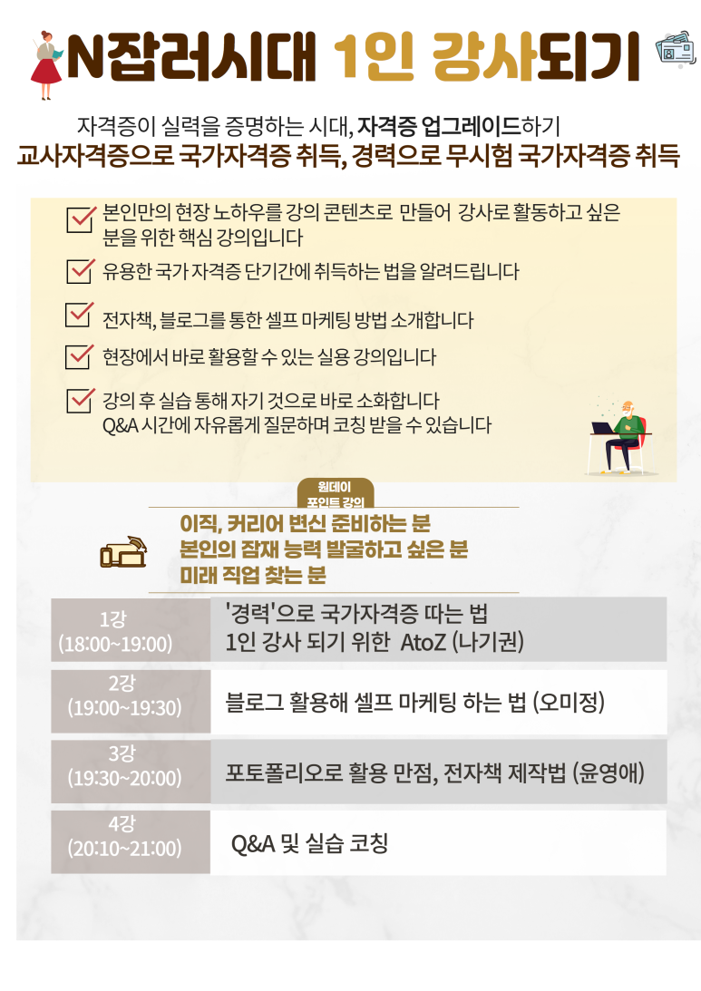 자격증 업그레이드+블로그 활용 셀프 마케팅+전자책 출간까지 하루 특강 안에 모두 담아 놨습니다.그동안 다양한 모임, 프로젝트, 코칭을 진행하면서 많은 분들이 목마르신 부분 위주로 강의를 구성했는데요.일시, 4월 29일(목) 오후 6시~9시 소규모 집회 스페이스 맥스(잠실역, 석촌역 부근) 강의 커리큘럼