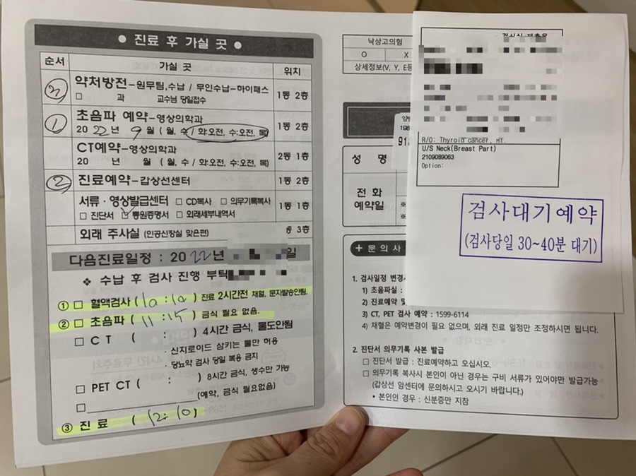 이미 검진을 받은 지 6개월 경과해 요항이 갑상샘암 수술 후 5차 검진이며 6개월 검진 3차(마지막) 다음 검사부터는 1년 텀으로 바뀐다.