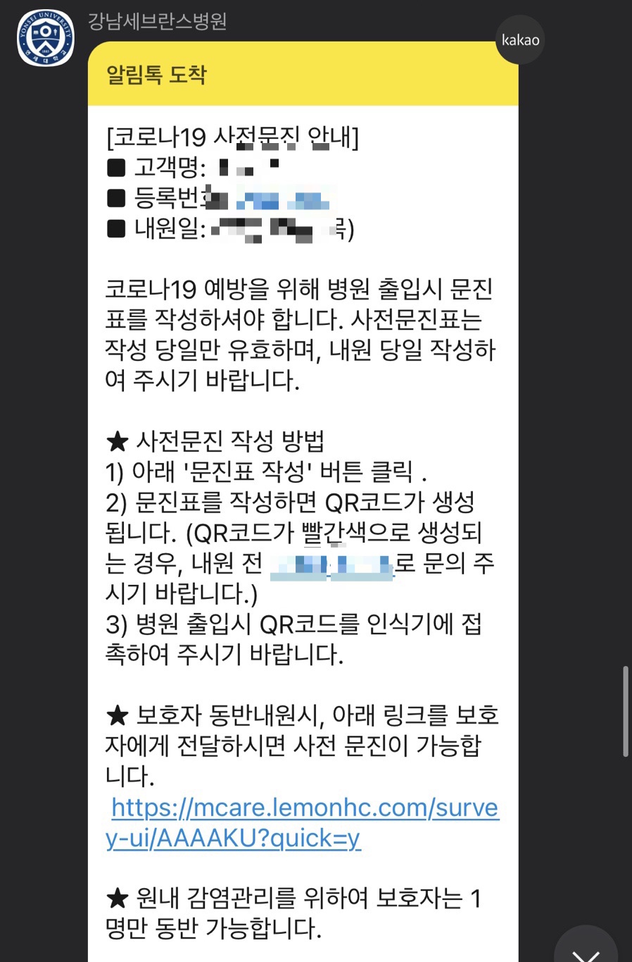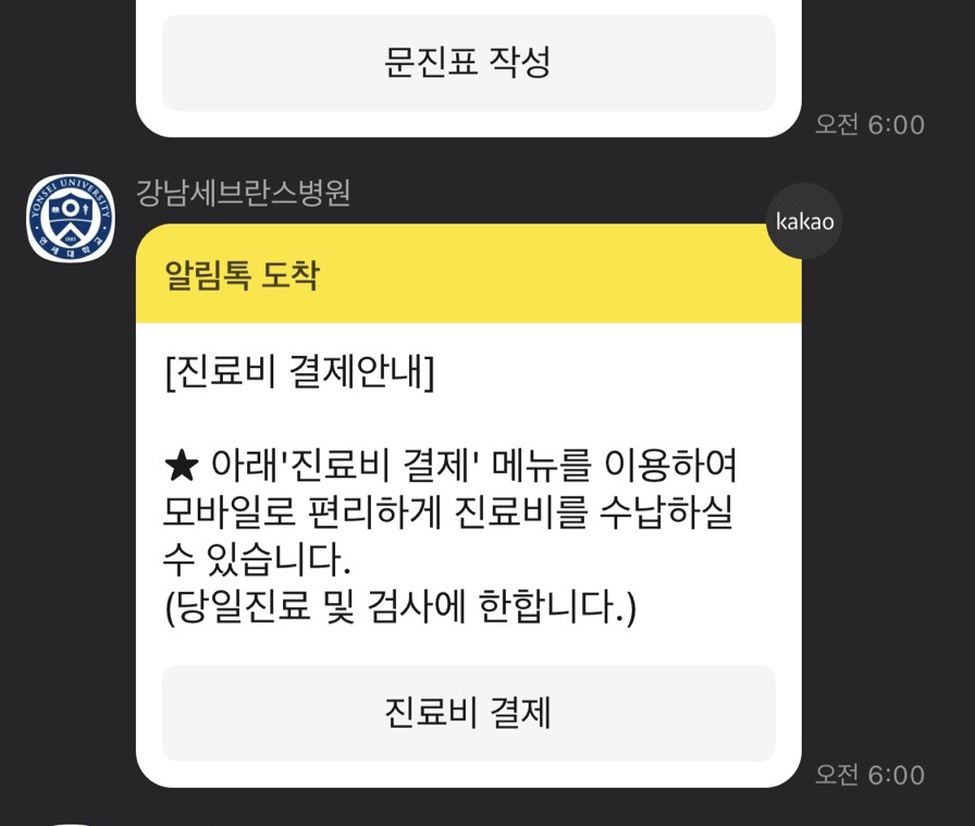 사전 문진하고 큐알코드 깔아놓으려고 했는데 카톡으로 진료비도 선불할 수 있다니… 무서운 카톡 ㅋㅋㅋ 난 그냥 가서 결제하기로..