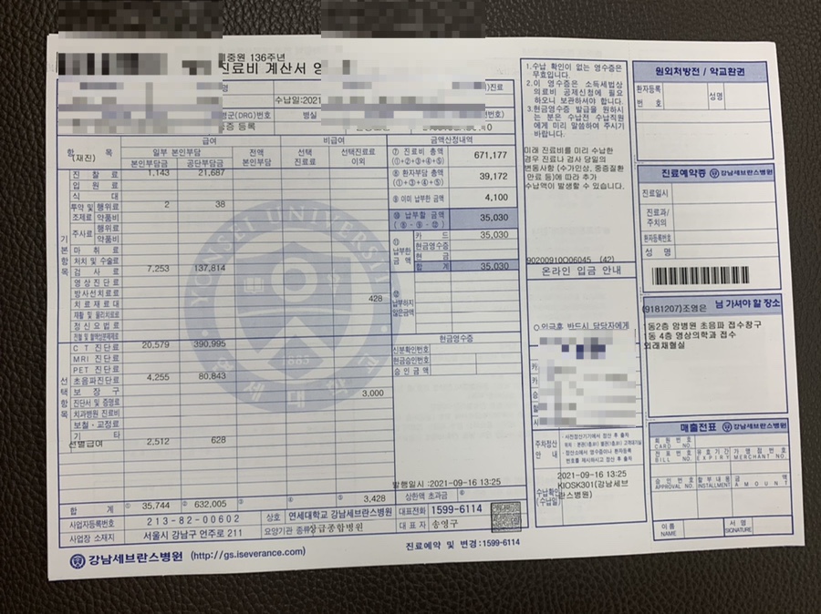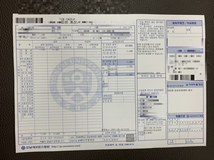 이번에는 혈액검사, ct, 갑상선 초음파를 찍기 때문에 검사 비용은 39,000원 정도.요전번 검사에서 4,100원이 남았는지 미리 납부되어 있다고 적혀있네.진료비는 1,100원의 중증 환자등록이 없었다면 혈액검사, ct검사, 갑상샘초음파, 진료비 비용으로 이날 하루 80만원 정도가 나왔을 것이다.중증환자들을 지원해 주어서 얼마나 다행인지…