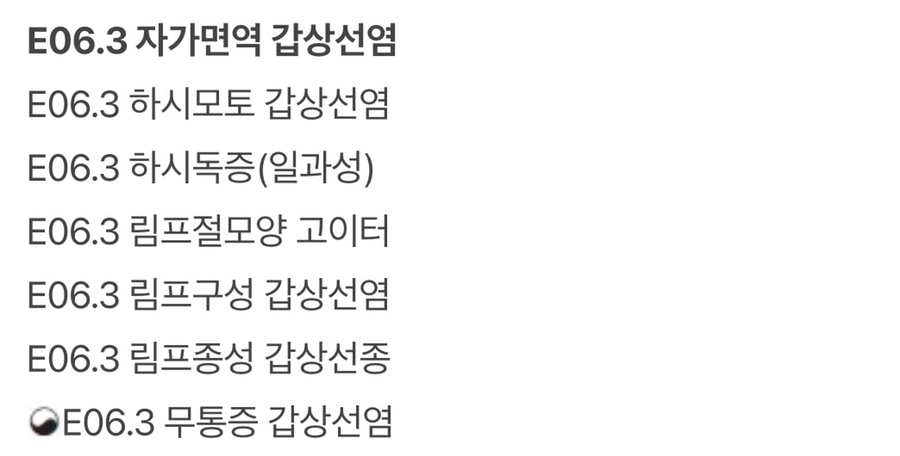 갑상선염(e06.3) 다시 생각해 보면 나는 갑상선암 이외에도 임파구성 갑상선염(e06.3)을 가지고 있어 음식에 영향을 받는 것이 아닌가 생각된다. 이전 검진 때 갑상선염이 있는데, 가볍게 말하고 통과했기 때문에 저도 가볍게 생각하고 통과했습니다만, 갑상선 수술 후 제가 경험하는 모든 증상이 이 임파구성 갑상선염의 증상이었어요.극심한 피로감, 무기력함, 두근거림, 부종, 체중 증가, 추위, 변비, 기억력 저하, 생리 주기의 변화 등 모두 있다.갑상선염이 갑상선 기능 저하증을 일으키는 원인 중 하나라고 하는데…그래서 예전에 tsh 수치가 높게 나왔나 해서..