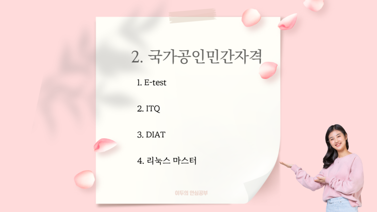 여기에 해당하는 것들은 누구나 조건만 충족하면 등록을 할 수 있기 때문에 질을 담보하기 어려운 경우가 많습니다. 실제로 취득해도 응시료만 지출할 뿐 그만큼 유용하게 쓰기가 어렵다. 보시면 앞서 언급한 것을 먼저 고려하시는 것을 권합니다.