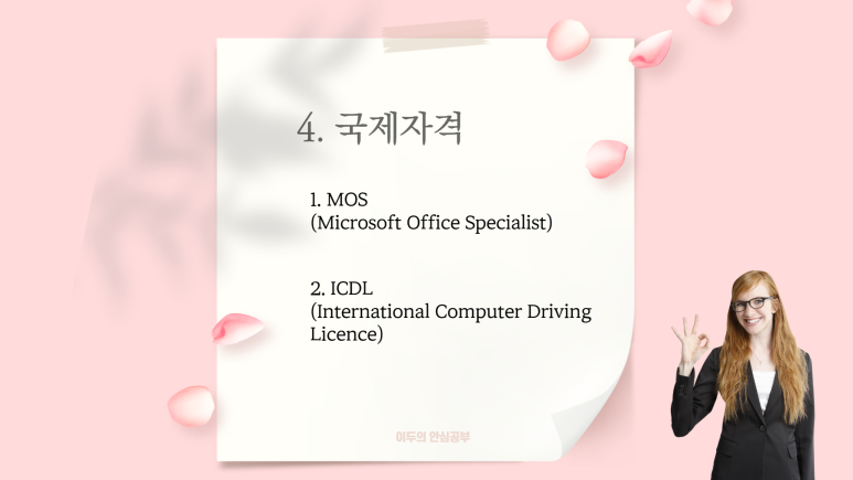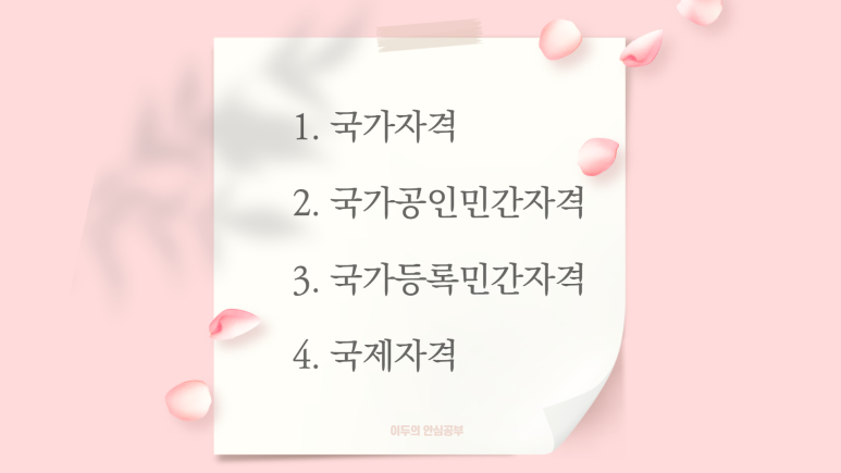“대한민국 자격증의 종류는 <자격기본법>에 따라 발행 주체에 따라 국가와 민간으로 나뉘는데, 민간은 국가가 공인하느냐에 따라 나뉩니다” 그리고 외국에서도 인정되는 것을 별도로 나누어 위와 같이 네 개로 나누어 보도록 하겠습니다.