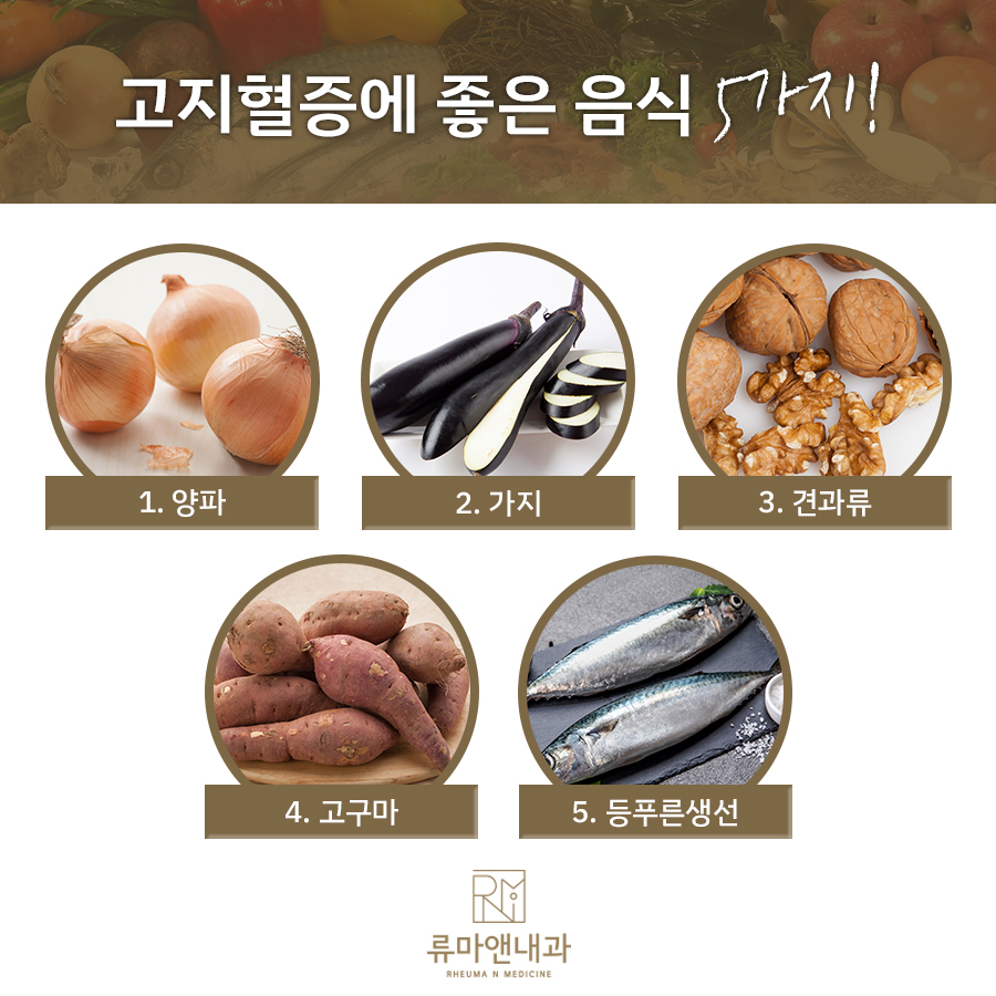 ① 양파: 양파에 들어있는 케르세틴이라는 성분이 항상화 작용효과를 발휘하므로 동맥경화를 방지하는 효능이 있습니다. 또한 양파에서 매운맛을 내는 유화 프로파일 성분이 혈액 속의 포도당 대사를 촉진시켜 혈당을 낮추는 것으로 알려져 있습니다. 특히 양파의 유화 프로필 성분은 가열되면 파괴되므로 양파는 가급적 가열하지 않은 날 것으로 섭취하는 것이 좋습니다.② 가지 : 가지는 콜레스테롤 수치가 높아지는 것을 방지하고 모세혈관을 튼튼하게 해주어 고지혈증에 좋은 음식입니다.③견과류 : 호두와 땅콩, 아몬드 등의 견과류는 불포화지방산이 풍부하게 함유되어 있습니다. 이 불포화 지방산의 나쁜 콜레스테롤을 제거하는 데에 도움이 되는 것으로 알려져 있습니다.④ 고구마:고구마는 체내에 쌓인 노폐물을 배출하여 콜레스테롤 수치 균형을 맞추기 때문에 고지혈증과 동맥경화 예방에 좋은 음식입니다.⑤등푸른생선 : 등푸른생선을 혈중 콜레스테롤 수치를 적정하게 유지시켜 줍니다. 불포화 지방산이 많이 함유되어 있어 나쁜 콜레스테롤을 제거해 줍니다.