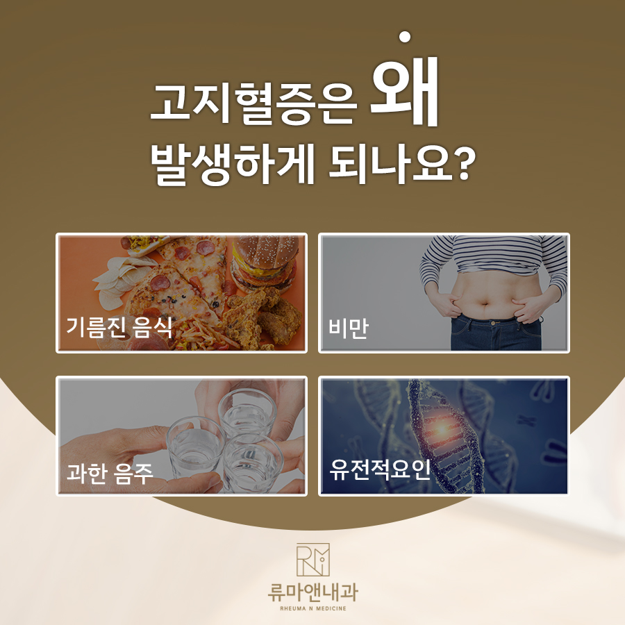 고지혈증의 발생 원인은 우리의 일상생활에서 흔히 볼 수 있는 음식, 술 등이 있으며 비만이나 유전적 요인에 의해 발생할 수도 있습니다. 우선 고지혈증은 콜레스테롤과 많이 관련이 있는데, 기름진 육류, 노른자, 새우, 오징어 같은 음식은 콜레스테롤이 많기 때문에 과도한 섭취는 고지혈증을 일으킵니다. 연말이 되면 많은 회식과 모임에서 술을 많이 마시게 됩니다. 술은 특히 중성지방혈증을 높이는 원인이 되며, 술자리의 안주는 고칼로리 음식이 대부분이므로 고지혈증의 원인이 되기도 합니다. 우리가 체중이 늘어나고 비만이 되면, 음식을 많이 먹게 되고, 운동을 하지 않은 상태에서 칼로리가 소비되지 않아서 고지혈증이 발생합니다. 비만도 아니고 음주, 기름진 음식을 과다 섭취하는 경우 등 특별한 문제가 없는데도 콜레스테롤이 높은 경우에는 유전적 요인에 의해 고지혈증이 발생하는 것입니다. 콜레스테롤을 혈액에서 얼마나 제거하고 얼마나 많이 만드는지는 유전적으로 결정됩니다.