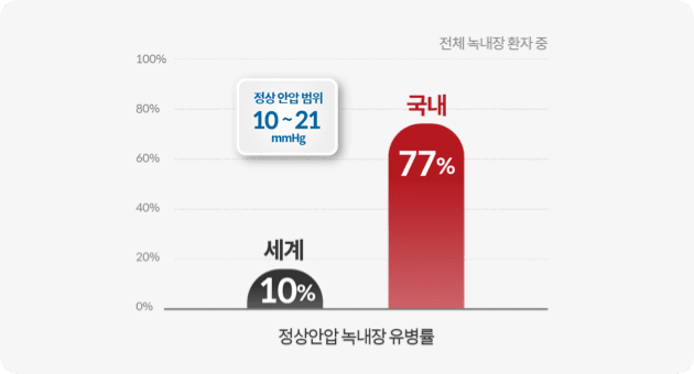 과거에는 안압이 높아져 시신경이 손상되는 개방각 녹내장이 많았으나 현재는 안압이 정상이면서 시신경 손상과 시야 장애를 보이는 정상 안압 녹내장이 많습니다. 특히 동양인에는 정상 안압 녹내장이 많고 안압 양상을 보면 대략 15~20mmHg 사이에 분포합니다. 안압은 정상적인 수준에 있으나 안과 검사상 개방각 녹내장의 양상, 즉시 신경의 형태에 이상이 있으며 시야 검사상의 시야 장애가 나타납니다. 편두통, 과거에 심한 출혈, 심장 혈관계 이상, 빈혈, 부정맥, 급성 저혈압과 같은 환자에게 정상 안압 녹내장이 많이 발생함에 따라 그 발생 원인은 안압에 대한 시신경의 저항력이 약하거나 시신경의 혈액 공급에 이상이 있을 것으로 추정되고 있습니다.