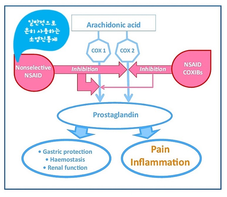 #NSAIDs(비스테로이성소염진통제)의 작용기 전에 많이 사용하는 NSAIDs는 #COX-1과 #COX-2의 작용을 억제하여 프로스타글란딘을 만드는 것을 방해하고 염증이 생기지 않도록 하며 통증을 완화시킵니다.